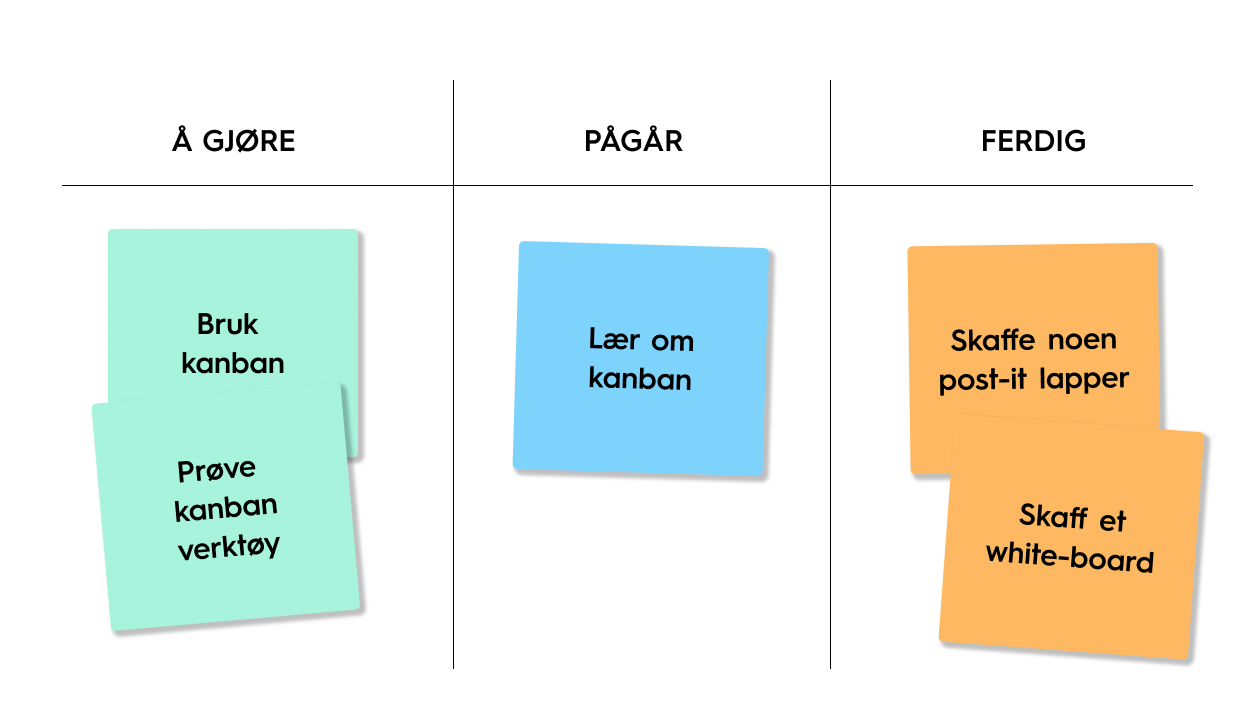 Figuren under viser et enkelt eksempel, og dette kan gjøres med post-it lapper på en tavle i et felles arbeidsrom, eller på digitale verktøy som Miro eller MS Teams. Dette kalles et Kanban board.